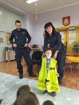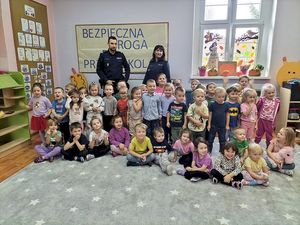 Policjanci omówili z dziećmi zasady jak bezpiecznie poruszać się po drodze, chodniku, poboczu oraz przy przechodzeniu przez jezdnię. Zawsze należy korzystać z przejść dla pieszych, uważnie rozglądać się przed wejściem na jezdnię i nigdy nie przebiegać na drugą stronę ulicy.